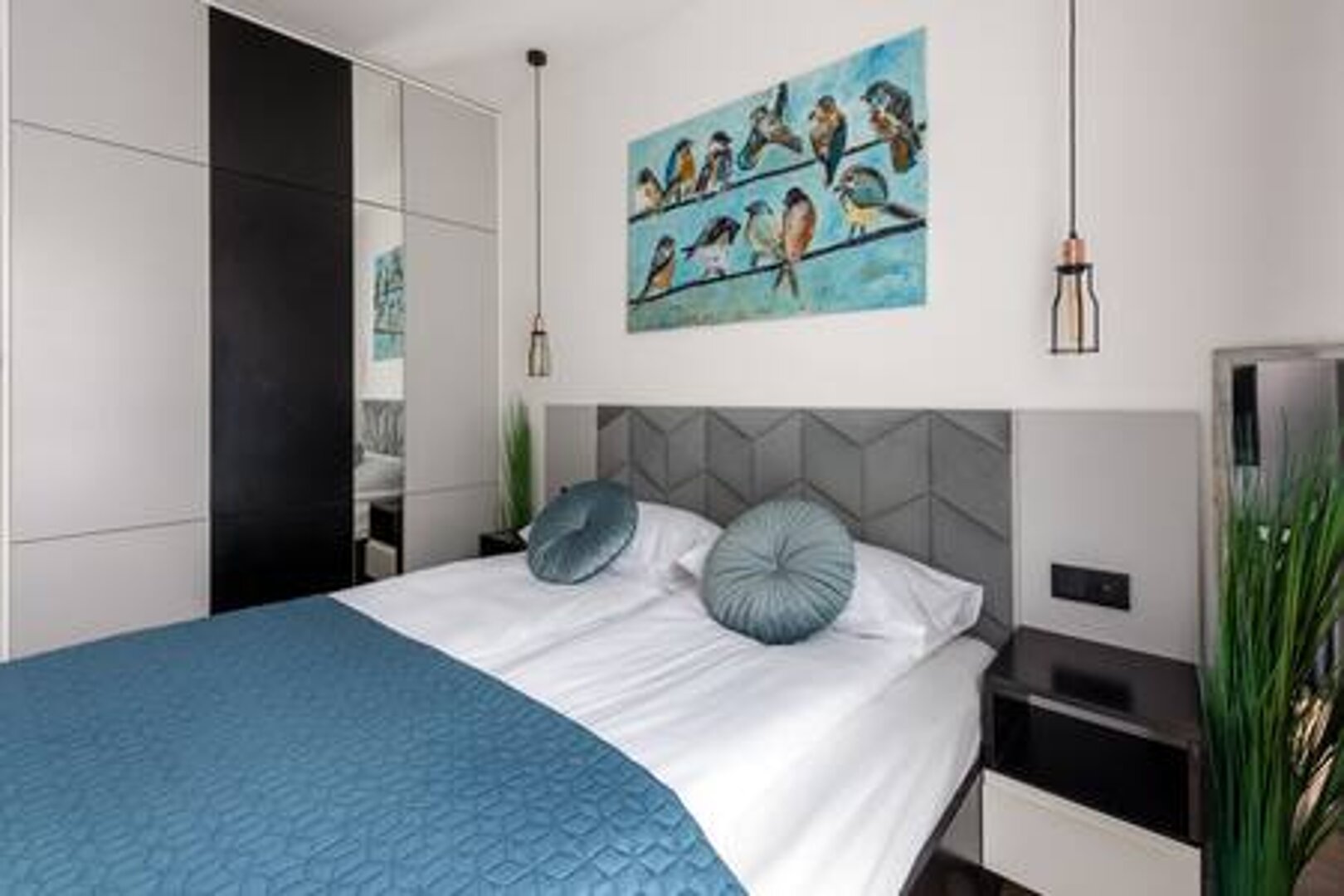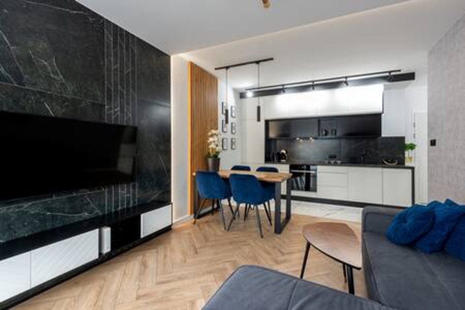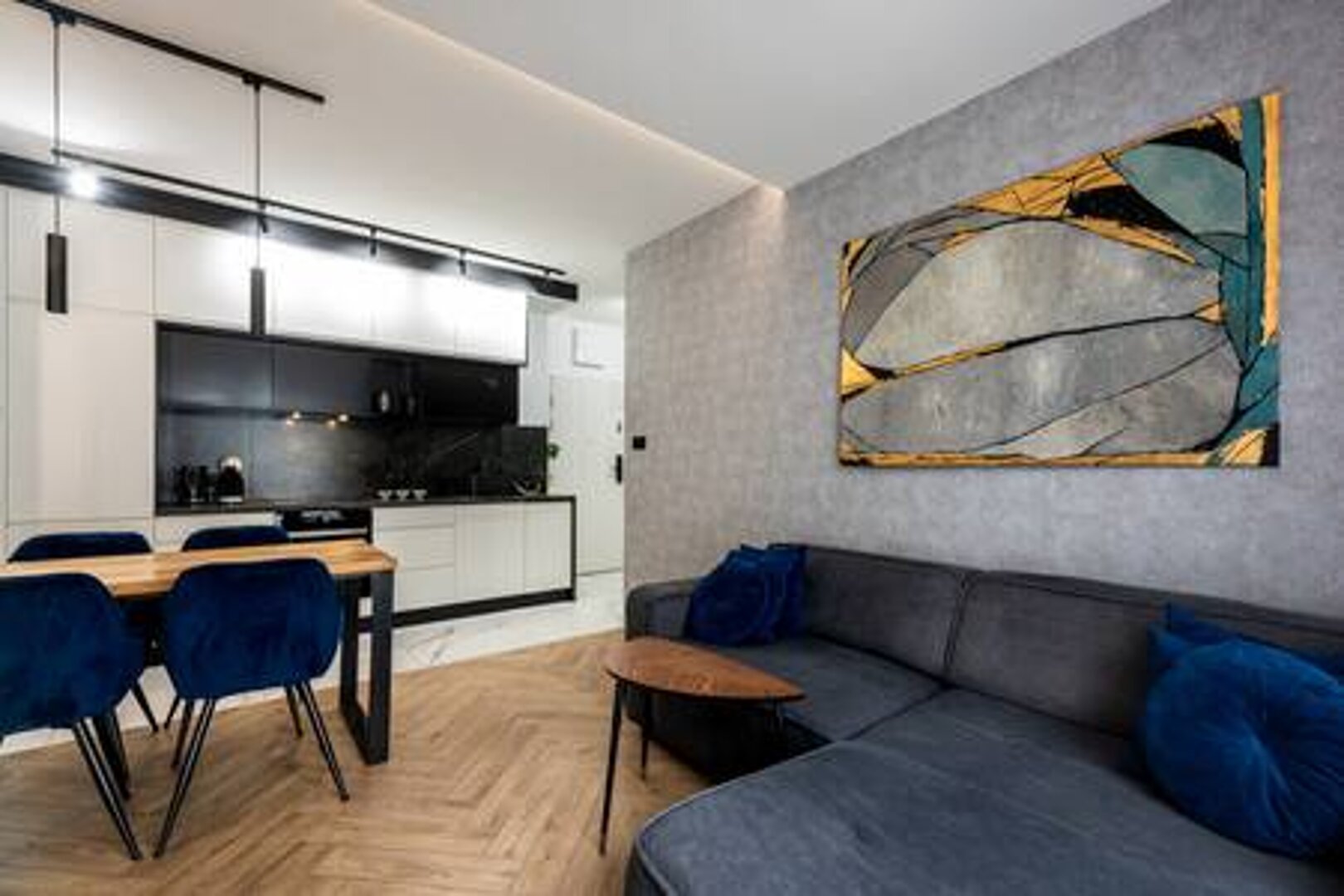 Luxurious 40 m2 apartment located on the first floor of a newly built, modern tenement house. Guests have at their disposal a small balcony, a bedroom with a queen bed and a living room with a kitchenette.