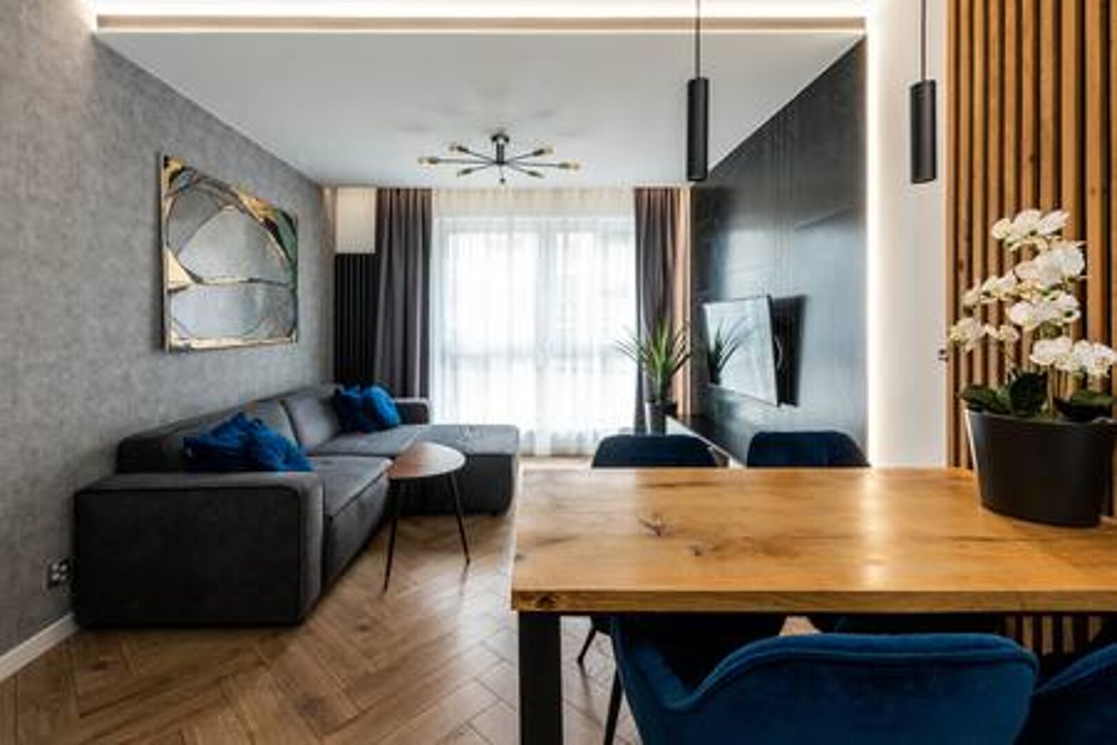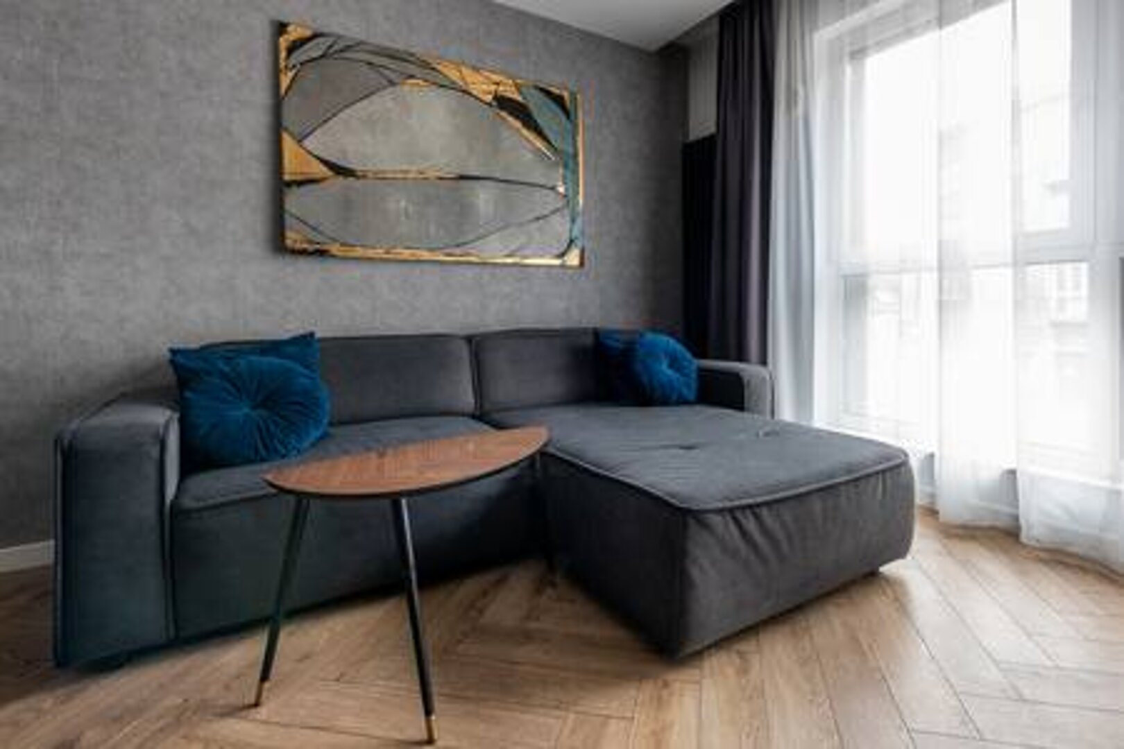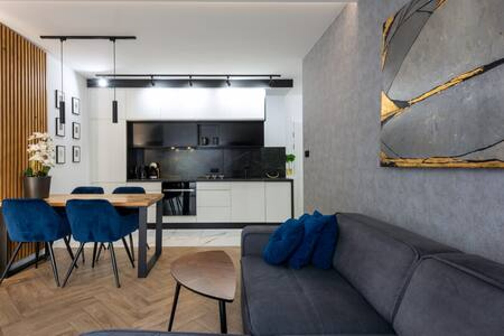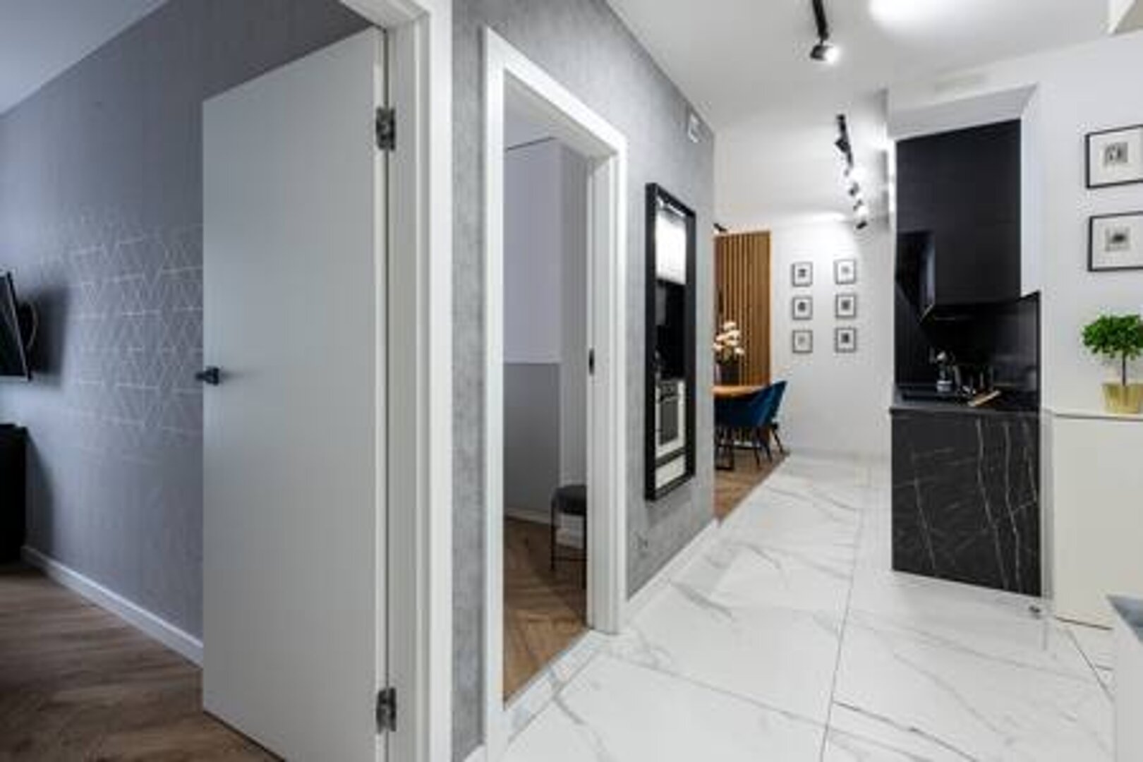 Luxurious 40 m2 apartment located on the first floor of a newly built, modern tenement house. Guests have at their disposal a small balcony, a bedroom with a queen bed and a living room with a kitchenette.