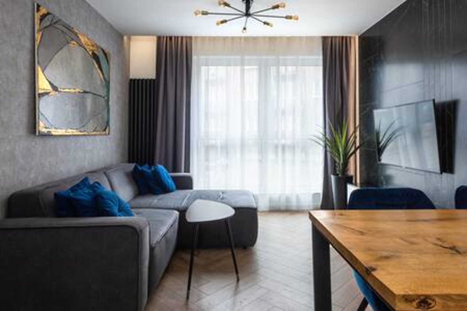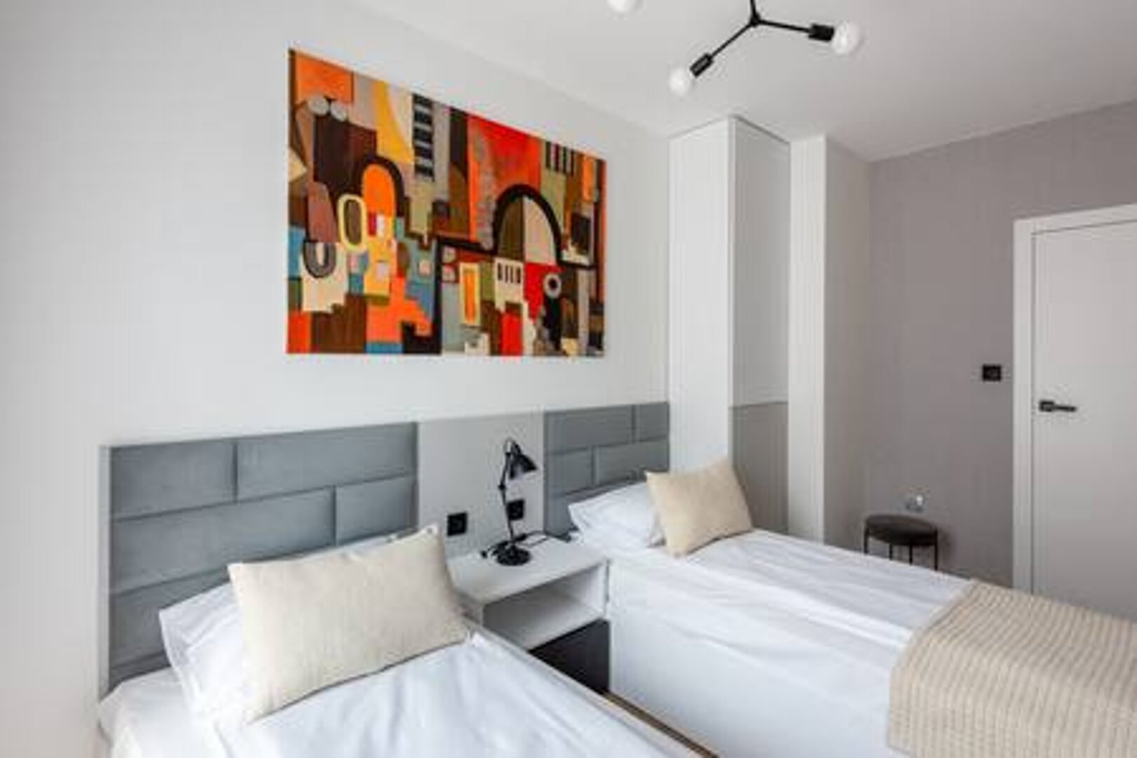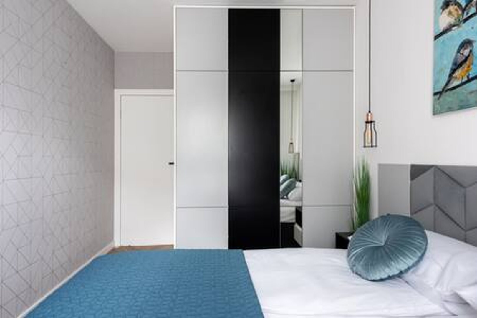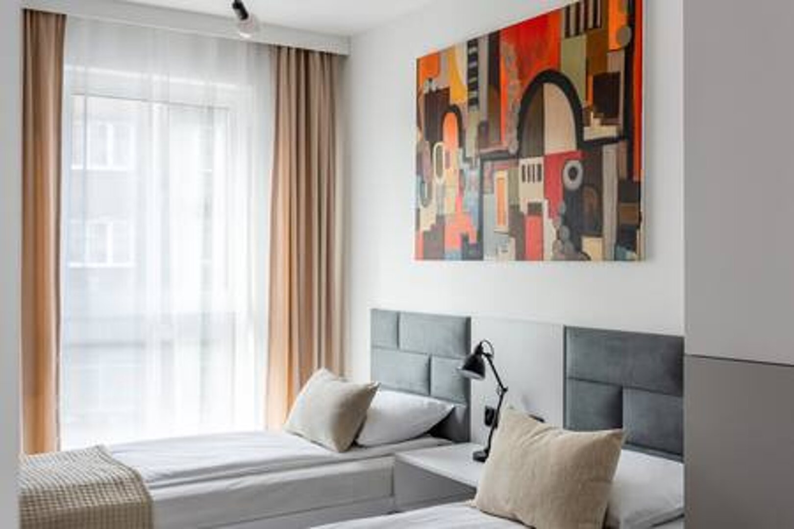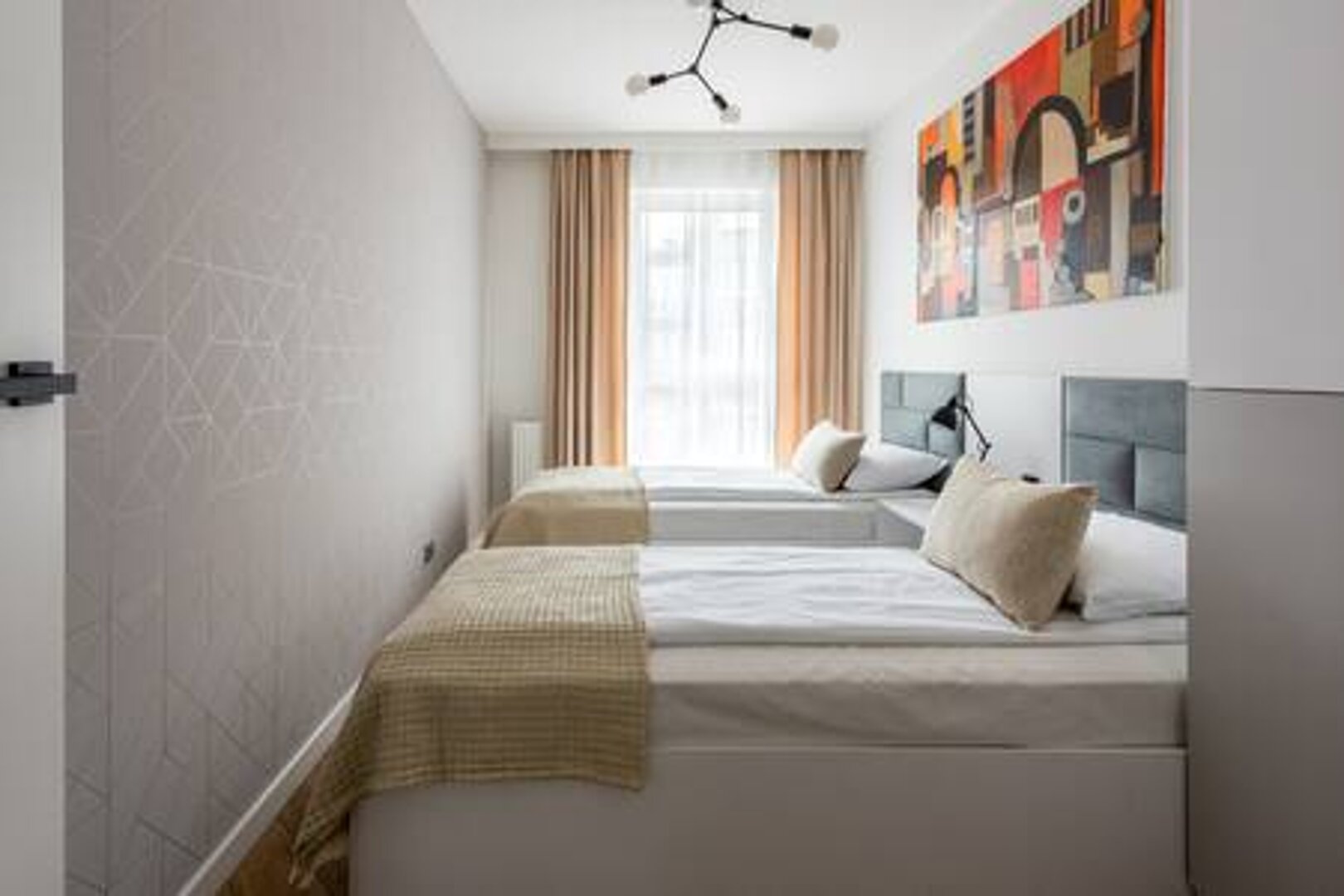 A modern apartment with an area of 65 m2 is located on the 7th floor of a newly built facility. Our Guests have at their disposal 1 bedroom with a queen bed, 1 bedroom with two single beds and a living room with two comfortable double sofas.