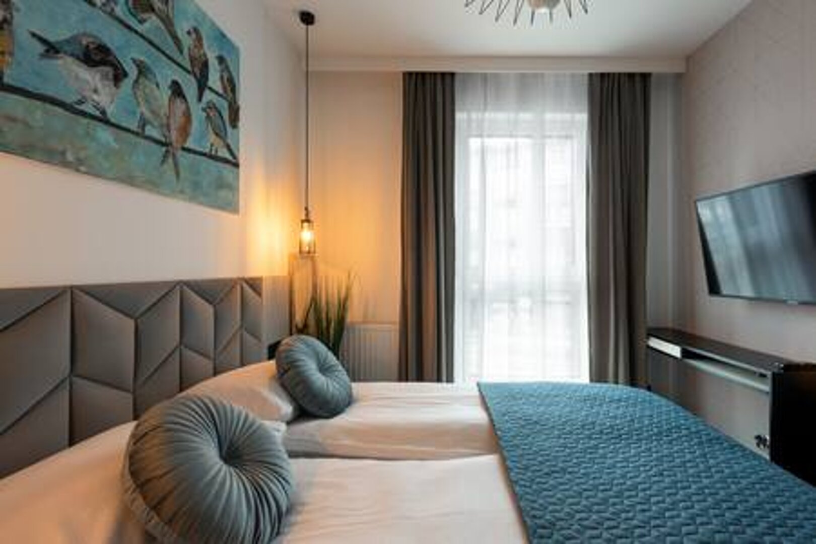 Luksusowy apartament o powierzchni 42 m2 znajduje się na II piętrze nowo wybudowanej, nowoczesnej kamienicy. Do dyspozycji jest balkon, sypialnia z łóżkiem typu queen, salon z aneksem kuchennym oraz łazienka. W salonie znajduje się rozkładana dwuosobowa s